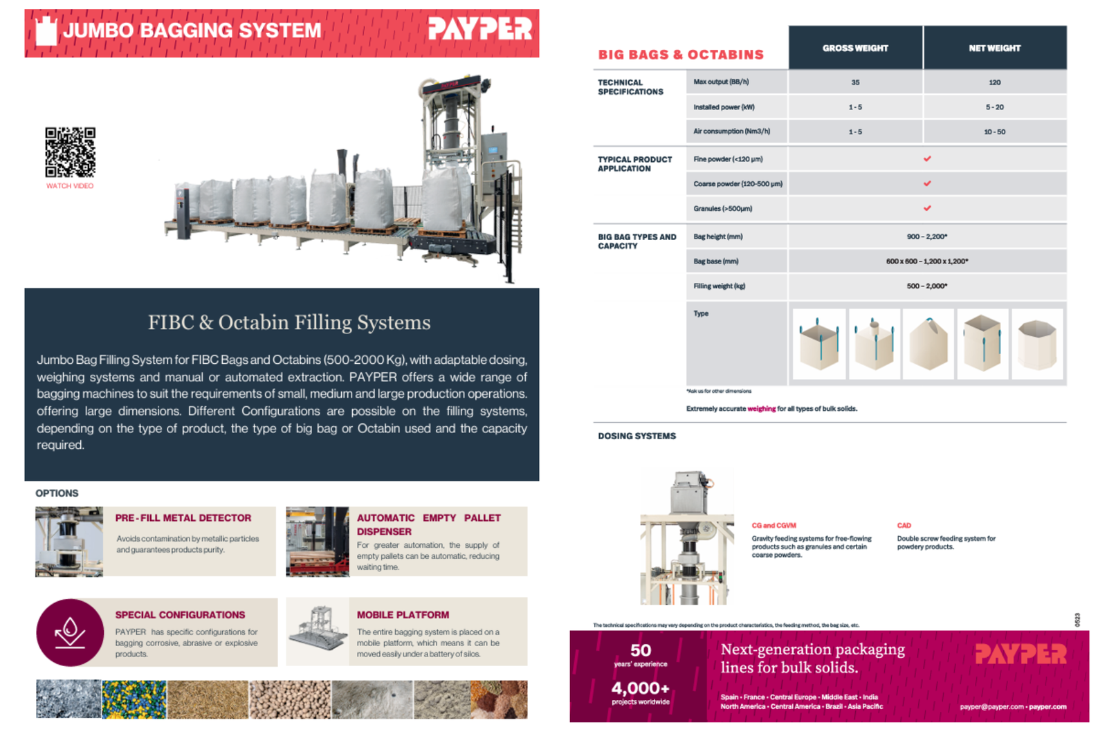 PAYPER’s Jumbo Bagging System can handle bags from 500 kg up to 2000 kg, with throughput capacities up to 30 tons per hour, depending on material type and feeding configuration.